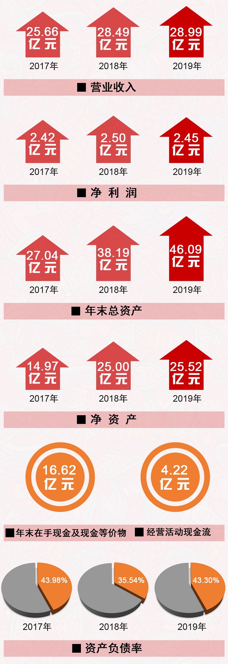 ±¨¸æÏÔʾ£¬£¬£¬£¬£¬£¬£¬2019Ä깫˾ʵÏÖÓªÒµÊÕÈë28.99ÒÚÔª£¬£¬£¬£¬£¬£¬£¬½ÏÉÏÄêͬÆÚÔöÌí1.73% £»£»£»£»£»£»¾»ÀûÈó2.45ÒÚÔª£¬£¬£¬£¬£¬£¬£¬ÓëÉÏÄê³Öƽ£¬£¬£¬£¬£¬£¬£¬·ºÆðÎȹÌÌ¬ÊÆ¡£¡£¡£¡£¡£Äêβ×Ü×ʲú46.09ÒÚÔª£¬£¬£¬£¬£¬£¬£¬Í¬±ÈÔöÌí20.70%£¬£¬£¬£¬£¬£¬£¬¾»×ʲú25.52ÒÚÔª£¬£¬£¬£¬£¬£¬£¬Í¬±ÈÔöÌí2.07%£»£»£»£»£»£»×ʲúÇ·Õ®ÂÊΪ43.30%£¬£¬£¬£¬£¬£¬£¬Ò»Á¬¼á³ÖÔڽϵ͵Äˮƽ¡£¡£¡£¡£¡£ÆÚÄ©³ÖÓÐÏÖ½ð¼°ÏÖ½ðµÈ¼ÛÎïÓà¶î16.62ÒÚÔª£»£»£»£»£»£»ÊµÏÖı»®Ô˶¯¾»ÏÖ½ðÁ÷4.22ÒÚÔª¡£¡£¡£¡£¡£ÔÚºê¹Û¾¼ÃÇéÐεÍÃÔ¼°ÐÐÒµÕûÌåÉú³¤µ¹Ô˵ÄÇéÐÎÏ£¬£¬£¬£¬£¬£¬£¬¹«Ë¾ÊµÏÖÁËÎȹÌÉú³¤£¬£¬£¬£¬£¬£¬£¬Î´·ºÆðı»®Î£º¦¡£¡£¡£¡£¡£